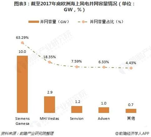 并網(wǎng)容量方面,截至2017年底,在歐洲累計并網(wǎng)的海上風(fēng)電機(jī)組中,Siemens Gamesa占據(jù)了最大的份額,占并網(wǎng)容量63.29%,占并網(wǎng)臺數(shù)63.80%,其次是MHIVestas占并網(wǎng)容量18.35%,占并網(wǎng)臺數(shù)22.13%。