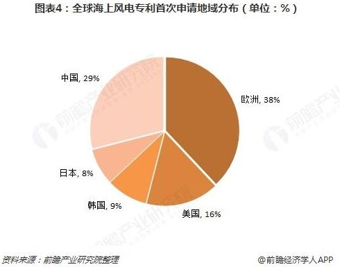 另外,歐洲還是全球海上風(fēng)電技術(shù)的原創(chuàng)大國。在全球海上風(fēng)電專利的首次申請上,歐洲專利申請數(shù)量達(dá)到3121件,占全球總申請量的比例分別為38%,表明歐洲在海上風(fēng)電領(lǐng)域原創(chuàng)技術(shù)的領(lǐng)先地位。