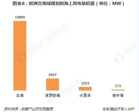 ——發(fā)電量 歐洲海上風(fēng)能發(fā)電量將隨著裝機(jī)容量的增長而提高,到2020年,海上風(fēng)力發(fā)電量將達(dá)到1482億千瓦小時,占?xì)W洲風(fēng)力發(fā)電量的四分之一,相當(dāng)于歐洲電力消費量的4%-4.2%。2030年,海上風(fēng)力發(fā)電量將達(dá)到5620億千瓦小時,占?xì)W洲風(fēng)力發(fā)電量的一半,相當(dāng)于歐洲電力消費量的13.9%。 ——區(qū)域分布 北海海域擁有豐富的海上風(fēng)能資源,將成為近期發(fā)展的重點區(qū)域,規(guī)劃的海上風(fēng)電裝機(jī)量比重約為19895MW。另外,一旦法國在大西洋的一些項目得到批準(zhǔn),大西洋的裝機(jī)量就會增加3GW。而地中海地區(qū)雖然一些項目已經(jīng)獲得批準(zhǔn),但是地中海區(qū)域裝機(jī)量在2020年之前并不會有明顯增長趨勢。