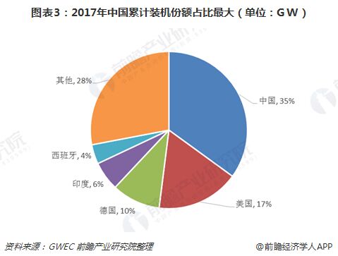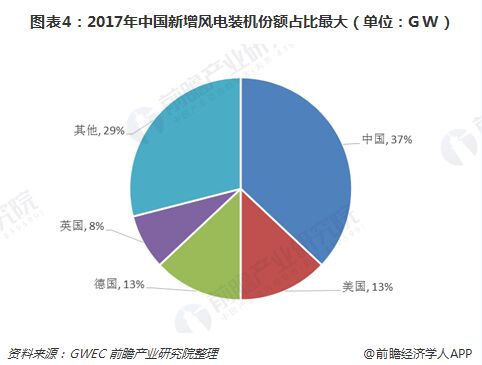 根據(jù)GWEC的數(shù)據(jù)顯示,2017年全球新增裝機(jī)容量為52.5GW。從新增裝機(jī)市場份額的占比來看,中國市場仍然為第一,占比約37%,高于排位第二的美國24個(gè)百分點(diǎn)。目前,我國風(fēng)電行業(yè)市場份額占比最大,并且新增裝機(jī)市場份額也最大,雙重保障,確保了我國市場為“主戰(zhàn)場”的地位不變。