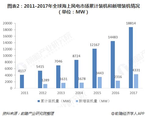 海上風(fēng)電雖然較陸上風(fēng)電起步晚,但是憑借海風(fēng)資源的穩(wěn)定性和大發(fā)電功率的特點(diǎn),海上風(fēng)電近年來正在世界各地飛速發(fā)展。數(shù)據(jù)顯示,2017年全球海上風(fēng)電吊裝容量恢復(fù)積極良好的發(fā)展勢頭,一掃2016年因英國市場政策改革(RO政策轉(zhuǎn)型為CFD機(jī)制)引起的發(fā)展放緩狀態(tài),全年新增裝機(jī)達(dá)到了4.3GW,實(shí)現(xiàn)創(chuàng)紀(jì)錄突破,截至2017年底,全球海上風(fēng)電累計(jì)裝機(jī)量18.81GW。
