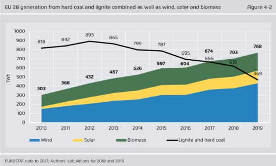 風能和光伏的供電量首次超過煤電 2019年,在歐盟的整體電力供應中,風能和光伏占了18% (569TWh),煤電占比下降至15% (469TWh)。而就在幾年前,歐盟的煤電發(fā)電量還是風能和光伏的兩倍。 圖表顯示2019年歐盟風電(藍色)、光伏(黃色)、生物質能(綠色)和煤電(黑色)的發(fā)電量。 煤電發(fā)電量迅速減少 在短短的一年內,歐盟煤電發(fā)電量下降了24%,比2007年少了一半多。2019年,歐洲電力行業(yè)的二氧化碳排放量下降了12%,這是1990年以來的最大降幅。 減少的煤電發(fā)電量一半被風能和光伏替代,另一半則被天然氣所替代。風能和光伏發(fā)電量上升得益于裝機的增加,同時歐洲內碳價的提高增強了天然氣發(fā)電相對于煤電的競爭力,推動天然氣發(fā)電量的增加。 天然氣發(fā)電增長有限 從2010年到2019年,煤炭在電力供應中的占比下降了10個百分點,而風能和光伏的總和則上升了13個百分點。 天然氣發(fā)電增加不多:盡管發(fā)電量增加,但2019年天然氣發(fā)電的份額仍比2010年低1個百分點;自2014年以來,歐洲只有7GW的新天然氣電廠上線。 風光裝機還將繼續(xù)增加 2019年,風電裝機容量增加了約14GW,為歷史第二高水平;太陽能裝機容量增加約17GW,是上一年速度的兩倍。 同時, 2019年,海上風能(英國)和太陽能(葡萄牙)的拍賣價格創(chuàng)歷史新低。 歐洲的風能和光伏行業(yè)協(xié)會預測,未來裝機的增速還將加快。 歐盟20國承諾淘汰煤電 2019年,希臘和匈牙利承諾將分別在2028年和2030年徹底淘汰煤電,至此歐盟共有20個國家承諾淘汰煤電。