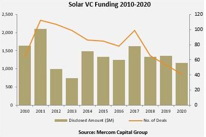 2020年上半年,由于突如其來的新冠疫情席卷全球,全球太陽能企業(yè)融資同比下降25%,但下半年復(fù)蘇迅速且廣泛,全年實現(xiàn)增長24%。其中,公開上市的太陽能公司度過了前所未有的一年。太陽能ETF上漲了225%,到2020年有15只太陽能股票上漲了100%以上。 Mercom Capital Group首席執(zhí)行官Raj Prabhu表示:“太陽能資產(chǎn)的收購在大流行的一年中達到了歷史最高水平,并且已經(jīng)成為投資天堂,尤其是在不確定的COVID經(jīng)濟中變得越來越受歡迎。” 2020年,太陽能行業(yè)的全球風(fēng)險投資和私募股權(quán)(VC/PE)達到41筆交易,累計規(guī)模12億美元,而2019年的53筆交易為14億美元。
