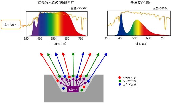京瓷株式會社開發(fā)出適用于水族箱的全光譜 LED 照明燈。京瓷的高顯色LED照明燈利用其自行研發(fā)的技術(shù),將紫色LED和RGB三原色(紅/綠/藍(lán)色)熒光體組合在一起,可營造出自然光照射到特定水下深度的效果,能模擬出接近珊瑚和水生植物自然棲息地的光線,適合不同水生生物的生長。光學(xué)光譜也可以進(jìn)行定制,可營造出適合觀賞的深藍(lán)色。