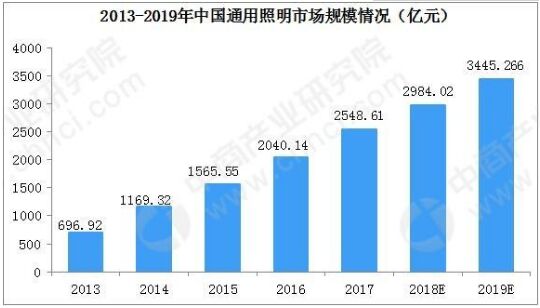 近年來,在全球大力推廣LED照明的背景下,世界主要國家相繼出臺(tái)淘汰白熾燈計(jì)劃,推動(dòng)了LED照明產(chǎn)品對(duì)白熾燈、熒光燈等傳統(tǒng)照明產(chǎn)品的加速替代。 世界各國和地區(qū)淘汰白熾燈計(jì)劃經(jīng)過多年的市場培育和技術(shù)投入,目前全球通用照明產(chǎn)業(yè)已呈現(xiàn)爆發(fā)式增長趨勢(shì)。在世界各國和地區(qū)節(jié)能、減排、環(huán)保等政策推廣支持下,2016年全球通用照明產(chǎn)品滲透率達(dá)31.30%。我國國內(nèi)照明市場方面,近年來通用照明是我國照明產(chǎn)業(yè)發(fā)展最快的領(lǐng)域。 2013-2017年,我國通用照明市場規(guī)模從約697億元增長至2549億元,此期間市場規(guī)模年復(fù)合增長率達(dá)45%。2019年市場規(guī)模將達(dá)到3445億元。
