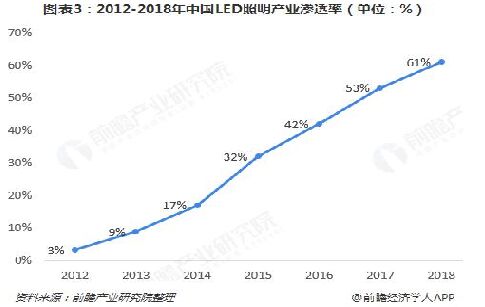 2020年行業(yè)產值規(guī)模突破1萬億元,滲透率達70% 2018年,LED照明行業(yè)作為節(jié)能減排的重點推行項目,在國家環(huán)保節(jié)能政策持續(xù)推行下,行業(yè)產業(yè)規(guī)模增速回暖,下游應用滲透率進一步擴大。未來,將繼續(xù)受益于傳統(tǒng)照明政府限制政策以及LED技術的節(jié)能環(huán)保特性,LED照明正在快速替代傳統(tǒng)照明市場。 其實,2017年,發(fā)改委等多部門聯合出臺了《半導體照明產業(yè)“十三五”發(fā)展規(guī)劃》,提出到2020年,我國半導體照明關鍵技術不斷突破,產品質量不斷提高,產品結構持續(xù)優(yōu)化,產業(yè)規(guī)模穩(wěn)步擴大,到2020年,半導體照明產業(yè)整體產值要達到10000億元,LED照明產品銷售額占整個照明電器行業(yè)銷售總額的比例要達到70%。