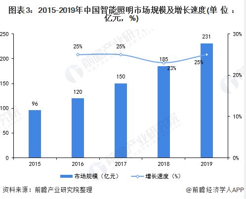 智能照明市場規(guī)模不斷擴大 隨著消費者對照明光效、個性化照明、節(jié)能環(huán)保等要求的提升,智能照明作為最行之有效的解決方案,將成為行業(yè)發(fā)展的必然趨勢。此外,近年來智能家居需求不斷增長,智能照明作為智能家居的切入點之一,受到照明企業(yè)以及智能控制企業(yè)的熱捧。2019年,中國智能照明市場規(guī)模約為231億元,同比增長約25%,逐步駛?cè)搿鞍l(fā)展快車道”。