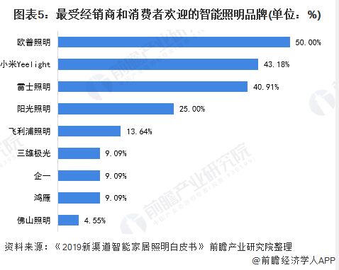 行業(yè)競爭逐漸激烈 2011年國家發(fā)改委等五部委發(fā)布了“中國逐步淘汰白熾燈路線圖”,提出白熾燈淘汰步驟。隨后,2015年2月份,亞明、陽光、鴻雁、歐普、飛利浦、木林森、科瑞、銳高、瑩輝、柏年、鼎暉、頓格等13家企業(yè)與結(jié)盟,簽訂了《共建智能照明聯(lián)合聲明》,抱團推廣智能照明。另一邊,照明企業(yè)也在謀求和互聯(lián)網(wǎng)企業(yè)的合作。2016年,與華為開始戰(zhàn)略合作,并在華為HiLink智慧家庭生態(tài)發(fā)布會上發(fā)布了合作后的首批產(chǎn)品。智能也和鴻雁電器達(dá)成合作。 根據(jù)智哪兒、、雷士照明、昕諾飛、涂鴉智能、上海聯(lián)通、華藝廣場、億美光電等一線單位和近20家的相關(guān)企業(yè)聯(lián)合編制的《2019新渠道智能家居照明白皮書》顯示,目前中國主要的智能照明品牌有歐普照明、小米Yeelight、雷士照明、陽光照明、飛利浦照明等,在《2019新渠道智能家居照明白皮書》調(diào)研中,上述品牌在“最受經(jīng)銷商和消費者歡迎的智能照明品牌”選項中占比分別為50%、43.18%、40.91%、25%、13.64%。 此外,在智能家居照明領(lǐng)域,阿里、騰訊、小米、海爾等互聯(lián)網(wǎng)、家電企業(yè)也跨界而來,開始照明設(shè)計和照明銷售,試圖打造自己的智能生態(tài)圈。
