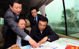 這是在前往工地途中,李克強(qiáng)聽(tīng)取有關(guān)部門(mén)和企業(yè)負(fù)責(zé)人匯報(bào)。李濤攝
