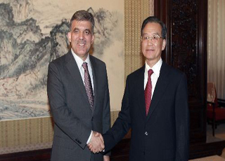中國(guó)總理溫家寶二十六日在中南海紫光閣會(huì)見(jiàn)土耳其總統(tǒng)居爾。溫家寶表示,雙方要擴(kuò)大在交通、電力、電信等領(lǐng)域的合作,鼓勵(lì)兩國(guó)企業(yè)加大相互投資。 溫家寶說(shuō),中土有著良好的政治關(guān)系和廣泛的合作領(lǐng)域,在維護(hù)世界和平、促進(jìn)不同文明對(duì)話、實(shí)現(xiàn)共同發(fā)展方面存在重要共識(shí)。面對(duì)復(fù)雜多變的國(guó)際形勢(shì),中方愿與土方加強(qiáng)溝通,相互支持,深化合作,推動(dòng)兩國(guó)關(guān)系發(fā)展得更加牢固和富有活力。 溫家寶指出,國(guó)際金融危機(jī)給中土兩國(guó)經(jīng)濟(jì)都造成嚴(yán)重沖擊。雙方要本著互利、開(kāi)放的精神,采取切實(shí)有效措施,保持貿(mào)易穩(wěn)定、平衡發(fā)展,擴(kuò)大在交通、電力、電信等領(lǐng)域的合作,鼓勵(lì)兩國(guó)企業(yè)加大相互投資。中土都是具有重要影響的發(fā)展中國(guó)家,要加強(qiáng)協(xié)作,維護(hù)共同利益,提高發(fā)展中國(guó)家在國(guó)際金融組織中的代表性和發(fā)言權(quán),推動(dòng)經(jīng)濟(jì)全球化朝著均衡、普惠、共贏方向發(fā)展。 居爾表示,土中兩國(guó)歷來(lái)相互支持,相互幫助,在重大國(guó)際和地區(qū)問(wèn)題上具有廣泛共識(shí)。土耳其高度贊賞中國(guó)在經(jīng)濟(jì)社會(huì)發(fā)展方面取得的巨大成就,希望與中國(guó)共同努力,深入挖掘土中經(jīng)濟(jì)合作潛力并將其提高到新水平。