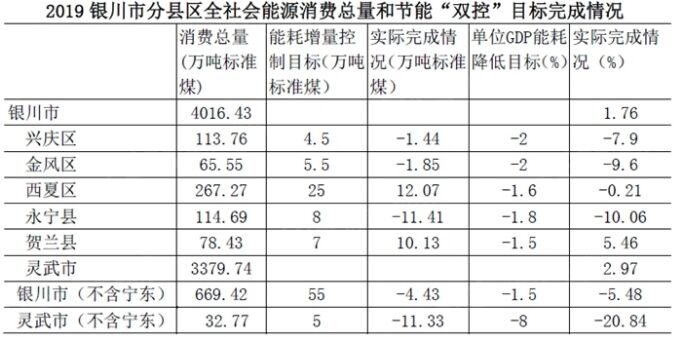 按照自治區(qū)年度考核5+1模式(寧東能耗等分項指標(biāo)單列),扣除寧東,銀川市全社會能源消費量669.42萬噸標(biāo)準(zhǔn)煤,同比下降0.66%,單位GDP能耗同比下降5.48%,年度消費量增量為減少4.43萬噸標(biāo)準(zhǔn)煤,超額完成了2019年銀川市(扣除寧東)單位GDP能耗下降1.5%,能源消費增量控制在55萬噸標(biāo)準(zhǔn)煤以內(nèi)的節(jié)能“雙控”目標(biāo)任務(wù)。 從分縣區(qū)2019年節(jié)能“雙控”目標(biāo)的完成情況看,賀蘭縣增量控制目標(biāo)和單位GDP能耗下降目標(biāo)均未完成,西夏區(qū)完成了增量控制目標(biāo),但未完成單位GDP能耗的下降目標(biāo),其它縣(市)區(qū)均較好的完成當(dāng)年的節(jié)能“雙控”目標(biāo)。