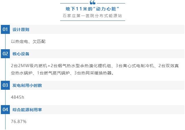 河北華電石家莊第一醫(yī)院(現(xiàn)稱石家莊市人民醫(yī)院)燃氣分布式能源項目采用以天然氣為基礎能源的先進的第三代冷、熱、電三聯(lián)供技術,為醫(yī)院提供制冷、采暖、供電、生活熱水以及醫(yī)用蒸汽綜合能源服務,是國內首批“自發(fā)自用、并網不上網”的天然氣分布式能源項目,機組配置優(yōu)化,兩個“欠匹配”,回歸分布式本質功能屬性,引領示范效應顯著。項目由華電分布式能源工程技術有限公司承建,建成后由石家莊華電供熱集團有限公司負責運營。 該項目的建設是落實國家節(jié)能政策,建設節(jié)約型社會,實現(xiàn)可持續(xù)發(fā)展戰(zhàn)略的需要,功能是為石家莊第一醫(yī)院項目提供冷、熱、電、蒸汽綜合能源服務,滿足醫(yī)院對能源的實際需求;夏季冷熱電聯(lián)供運行時,發(fā)電機組的高溫冷卻水可根據(jù)用能需求用于制冷或供熱,運行控制先進適應性強;低溫煙氣用于制取生活熱水,排煙溫度低,能源綜合利用率高,該項目引入市政熱網作為采暖季熱源之一。 該項目建成后,與同容量常規(guī)燃煤熱電廠相比,年節(jié)約標煤2974.35t/a,節(jié)能率為27%;年CO₂減排12156.18t/a,減排率為48%,具有較好的經濟和環(huán)境效益。設備滿足節(jié)能減排,提高經濟效率的需要,對區(qū)域環(huán)境改善作用巨大。