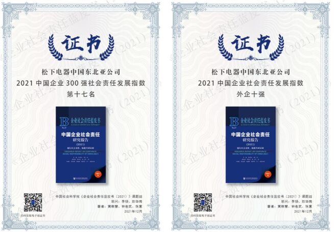 2021年12月3日,由中國社科院舉辦的“第十三屆《企業(yè)社會責任藍皮書》發(fā)布會”在京舉辦。在本次活動中,發(fā)布了最新的中國企業(yè)300強(國企、民企、外企)社會責任發(fā)展指數排名,松下電器取得了總排名第17位,外企第3名的優(yōu)異評價。