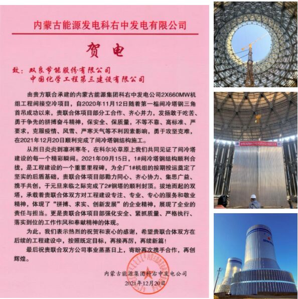 2021年,在內(nèi)蒙古這片草原熱土上,雙良為電廠建設(shè)的智能化大型鋼結(jié)構(gòu)間冷系統(tǒng)中,已有4座鋼結(jié)構(gòu)間冷塔順利完成了封頂合攏,分別是國(guó)電雙維上海廟電廠一期項(xiàng)目和蒙能集團(tuán)科右中發(fā)電廠項(xiàng)目。同時(shí)國(guó)電雙維上海廟電廠二期項(xiàng)目和國(guó)電建投長(zhǎng)灘電廠項(xiàng)目的建設(shè)正在穩(wěn)步推進(jìn)中。在國(guó)家大氣污染防治和節(jié)能減排的發(fā)展戰(zhàn)略下,因?yàn)楣?jié)能節(jié)水環(huán)保的特性,采用鋼結(jié)構(gòu)間冷塔必將成為未來火電行業(yè)的潮流。雙良節(jié)能將一如既往秉持“弘揚(yáng)工匠精神,鑄造鐵軍團(tuán)隊(duì)”,為中國(guó)電力建設(shè)精品工程,為實(shí)現(xiàn)“碳中和”目標(biāo)貢獻(xiàn)力量。