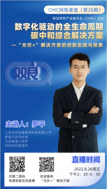 2022年8月26日(周五下午)兩點半,由清潔供熱產(chǎn)業(yè)委員會(CHIC)主辦的“CHIC網(wǎng)絡課堂”將邀請到上海雙良智慧能源科技有限公司數(shù)智開發(fā)部經(jīng)理羅平為大家分享《數(shù)字化驅(qū)動的全生命周期碳中和綜合解決方案—“光伏+”解決方案的創(chuàng)新實踐與探索》主題講座。