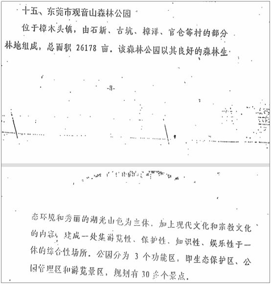 陳老師向作者介紹,觀音山公園2007年申報(bào)的總體規(guī)劃圖是廣東省林業(yè)局申報(bào)批復(fù)的,而2007年的數(shù)據(jù)是來(lái)源于2005 年12月23日原國(guó)家林業(yè)局批準(zhǔn)觀音山為國(guó)家級(jí)森林公園經(jīng)營(yíng)面積 657.18 公頃,以及地理坐標(biāo)、四界。而觀音山最原始的面積數(shù)據(jù)是來(lái)源于東莞市人民政府于2000年12月21日批準(zhǔn)成立東莞市觀音山森林公園的(東府辦復(fù)【2000】458 號(hào)文),位于樟木頭鎮(zhèn),由石新、古坑、樟洋、官倉(cāng)等村的部分林地組成,總面積26178畝。