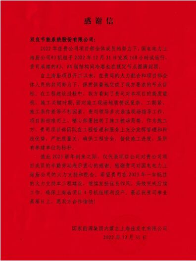 給雙良節(jié)能的感謝信