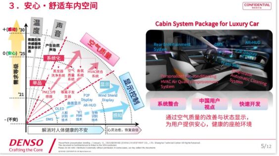 延伸至汽車座艙領(lǐng)域,電裝希望通過(guò)人性化的顯示設(shè)置、提供優(yōu)質(zhì)空氣,創(chuàng)造出令人安心舒適的車內(nèi)空間;運(yùn)用AI系統(tǒng)預(yù)測(cè)危險(xiǎn)場(chǎng)景、在不過(guò)度干擾駕駛的狀態(tài)下通過(guò)HUD、液晶儀表等顯示設(shè)備向駕駛員提供信息,進(jìn)而消除交通事故實(shí)現(xiàn)自由出行!半娧b的目的是運(yùn)用豐富的經(jīng)驗(yàn)和技術(shù),通過(guò)系統(tǒng)整合最終實(shí)現(xiàn)便利性、舒適性和美感三大價(jià)值。”邵旻說(shuō)。