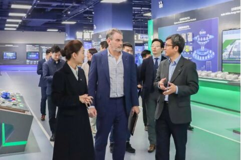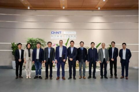 4月6日,德國萊茵TüV集團(以下簡稱“TüV萊茵”)全球產(chǎn)品服務執(zhí)行副總裁Kimmo Fuller一行赴正泰新能源杭州園區(qū)走訪交流。正泰新能源董事長兼總裁陸川熱情接待。