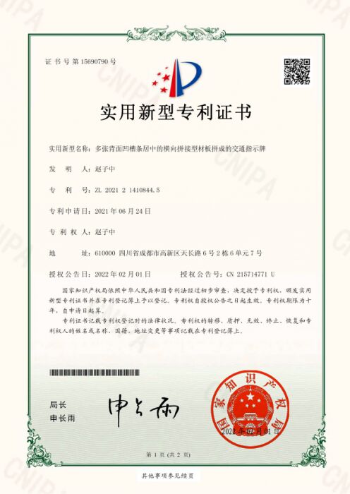 (交通指示牌的新型材料專利證書)