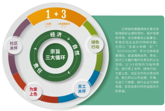 立邦在保持主營業(yè)務(wù)取得良好成績的同時,保護資源和環(huán)境,關(guān)注慈善及公益事業(yè),積極實現(xiàn)企業(yè)的可持續(xù)發(fā)展。 “永續(xù)大地精‘彩’”可持續(xù)發(fā)展理念,立邦以“經(jīng)濟循環(huán)、自然循環(huán)、責(zé)任循環(huán)”對應(yīng)“公司治理、環(huán)境、社會”,以三大循環(huán)推動企業(yè)的可持續(xù)發(fā)展,刷新特色CSR體系,向ESG治理進階。以立邦公司為“1”,以利益相關(guān)方為“3”,建立1+3機制,讓“經(jīng)濟循環(huán)、自然循環(huán)、責(zé)任循環(huán)”不止于企業(yè)內(nèi)部,而是衍生至全社會。同時,立邦開展綠色行動、踐行員工關(guān)懷、注重社區(qū)關(guān)懷、推動「為愛上色」公益平臺,用全情投入和切實行動,以實現(xiàn)三大循環(huán),讓“永續(xù)大地精‘彩’”有自然之美、人文之美、發(fā)展之美。