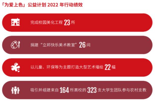 立邦「為愛上色」項目自2009年發(fā)起運營至今,持續(xù)通過校園環(huán)境美化、美術(shù)教室捐贈、藝術(shù)家墻繪創(chuàng)作、農(nóng)村支教等行動為世界帶去愛、色彩與歡樂。去年,立邦「為愛上色」成績突出:為23所校園進行彩色涂刷,累計共為406所鄉(xiāng)村學(xué)校刷新校園空間。捐贈26間學(xué)校美術(shù)教室,累計共捐建390間“立邦快樂美術(shù)教室”以支持鄉(xiāng)村美術(shù)教育發(fā)展。創(chuàng)作22幅大型墻繪,累計共創(chuàng)作214幅墻繪創(chuàng)作,助力將藝術(shù)和色彩融入當(dāng)?shù)匚幕。攜手“知行計劃”繼續(xù)開展中國大學(xué)生農(nóng)村支教獎,來自164所高校大學(xué)生團隊報名參與,開展支教活動2,112+天,惠及4,0000+名鄉(xiāng)村師生。