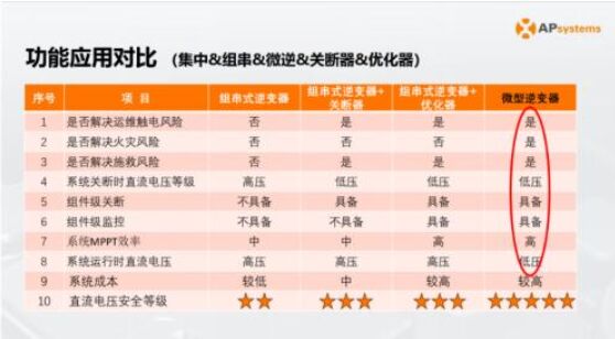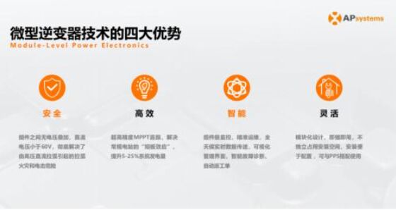 伴隨分布式光伏的加速滲透,安全、智能、靈活逐漸成為光伏逆變器重要的衡量標(biāo)準(zhǔn),以微型逆變器為代表的MLPE的技術(shù)優(yōu)勢(shì)也日益凸顯。對(duì)此,周總綜合對(duì)比組串式逆變器、微型逆變器、關(guān)斷器和優(yōu)化器的技術(shù)特點(diǎn),指出:微型逆變器技術(shù)路線具有安全、高效、智能、靈活四大優(yōu)勢(shì)。