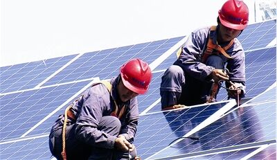 電力工人正在太湖源鎮(zhèn)浪口村安裝屋頂太陽能光伏發(fā)電板。