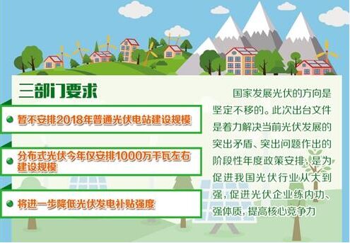 光伏發(fā)電裝機規(guī)模高速增長的時代或將結束。近日,國家發(fā)展改革委、財政部、國家能源局聯(lián)合印發(fā)《關于2018年光伏發(fā)電有關事項的通知》,要求合理把握發(fā)展節(jié)奏,優(yōu)化光伏發(fā)電新增建設規(guī)模,暫不安排2018年普通光伏電站建設規(guī)模,在國家未下發(fā)文件啟動普通電站建設工作前,各地不得以任何形式安排需國家補貼的普通電站建設。而在分布式光伏方面,今年僅安排1000萬千瓦左右建設規(guī)模。此外,將進一步降低光伏發(fā)電補貼強度。 近年來,我國光伏發(fā)電新增裝機規(guī)模連續(xù)5年全球第一,累計裝機規(guī)模連續(xù)3年位居全球第一。光伏技術不斷創(chuàng)新突破、全球領先,并已形成具有國際競爭力的完整的光伏產業(yè)鏈。但另一方面,也存在光伏發(fā)電棄光問題顯現(xiàn)以及補貼需求持續(xù)擴大等問題,直接影響光伏行業(yè)健康有序發(fā)展,需要根據(jù)新形勢、新要求調整發(fā)展思路,完善發(fā)展政策。