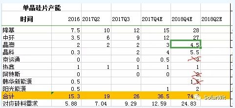 上面這張截圖是2017年年底總結(jié)的,現(xiàn)在回顧他發(fā)現(xiàn)基本不用修改,因為沒有新增的進入者,反倒是有幾家公司并沒有如期達產(chǎn);京運通原本計劃中的3GW產(chǎn)能現(xiàn)在也沒有蹤影;阿特斯之前拋出了雄心勃勃的計劃,但實際上目前只有24臺單晶爐做中試線;韓華新能源也同樣,并沒有有效產(chǎn)能出來,依然需要通過外部采購。當前市場中有效的單晶硅片產(chǎn)能實際上只有四家但是由于晶科、晶澳只自用不外供,所以對于市場上第三方公開對外銷售的產(chǎn)能,有效供給只有兩家:隆基和中環(huán),在硅片環(huán)節(jié),迅速地形成了雙寡頭壟斷的產(chǎn)業(yè)格局。這是供給端,我們再看看單晶硅片的需求端: