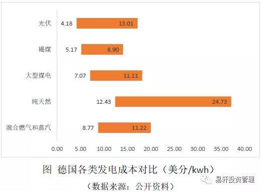 德國電廠每千瓦時純天然氣發(fā)電量的平均成本仍然很高,每千瓦時在0.1103~0.2194歐元之間,褐煤每千瓦時為0.0459~0.079歐元,大型燃煤電廠每千瓦時為0.0627~0.0986歐元,混合燃氣和蒸汽發(fā)電廠每千瓦時為0.0778~0.0996歐元。在光照條件好的地區(qū),德國光伏發(fā)電成本已經(jīng)成為最低的發(fā)電類型,而且也基本與其他發(fā)電端成本相差不大。