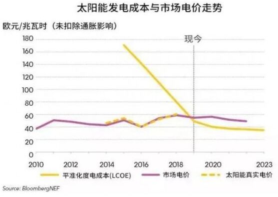 圖中黃色實(shí)線為L(zhǎng)COE(平準(zhǔn)化度電成本,Levelized Cost of Energy),是國(guó)際上通用的評(píng)價(jià)度電成本的指標(biāo)。紅色實(shí)線為市場(chǎng)電力價(jià)格。圖片來(lái)源:BNEF