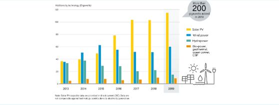 近日,全球可再生能源權(quán)威平臺(tái)——REN21發(fā)布了《 2020年全球可再生能源狀況報(bào)告》(GSR2020)。報(bào)告稱,2019年全球新增可再生能源裝機(jī)容量超過200GW,其中光伏占比最高,新增裝機(jī)量達(dá)到115GW,同比增長(zhǎng)12%。截止至2019年底,光伏累計(jì)裝機(jī)容量達(dá)到627GW。