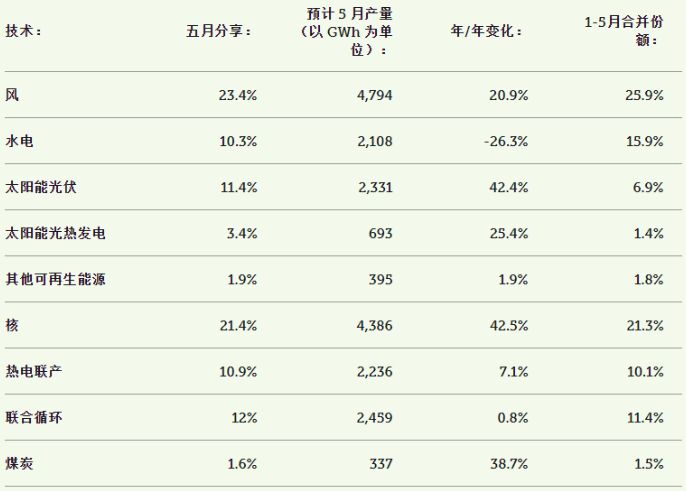 根據(jù)西班牙電網(wǎng)運營商 Red Electrica de 近期發(fā)布的最新數(shù)據(jù)顯示,5 月份可再生能源生產(chǎn)了西班牙 50.7%的電力,與去年同期相比,“綠色吉瓦時”增加了10%。 這是可再生能源電力在連續(xù)兩個月下降后重獲增長,4 月份西班牙電力生產(chǎn)結(jié)構中的可再生能源份額為 46.2%。 REE還強調(diào)了太陽能光伏電站實現(xiàn)的創(chuàng)紀錄產(chǎn)量,5 月份光伏發(fā)電量為2,331GWh,創(chuàng)下自2007年國家記錄光伏發(fā)電量以來最高的月產(chǎn)量。 下表總結(jié)了西班牙 5 月份電力結(jié)構的構成: