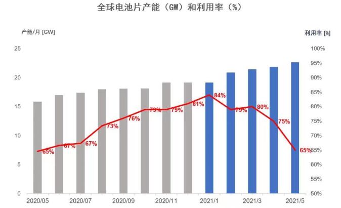 備注:根據(jù)賀利氏內(nèi)部數(shù)據(jù),6月份全球太陽能電池片產(chǎn)能利用率進(jìn)一步下降,目前產(chǎn)能利用率保持在65%左右