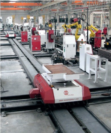 RGV 小車在三一臨港生產(chǎn)基地的結(jié)構(gòu)件焊接車間中用于全自動(dòng)生產(chǎn)挖掘機(jī)挖斗和動(dòng)臂