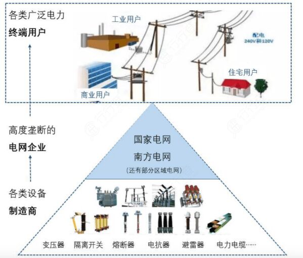 電網(wǎng)產(chǎn)業(yè)鏈下游是廣泛的終端用戶(hù),電網(wǎng)企業(yè)提供輸送電服務(wù),用戶(hù)向電網(wǎng)企業(yè)支付電費(fèi)(目前電網(wǎng)企業(yè)仍然是最主要的售電主體),根據(jù)電價(jià)的差異,大致可以將用戶(hù)分為:大工業(yè)、一般工商業(yè)、居民以及農(nóng)業(yè)生產(chǎn)四類(lèi),其中大工業(yè)和一般工商業(yè)用戶(hù)對(duì)應(yīng)的電價(jià)高于居民和農(nóng)業(yè)生產(chǎn)用電價(jià)。 中游是電網(wǎng)建設(shè)及運(yùn)營(yíng),傳統(tǒng)模式下電網(wǎng)企業(yè)進(jìn)行網(wǎng)架建設(shè)投資,通過(guò)購(gòu)售電價(jià)差,收回投資及賺取收益。 電網(wǎng)的上游包括建設(shè)環(huán)節(jié)的設(shè)備企業(yè)和運(yùn)營(yíng)環(huán)節(jié)的發(fā)電企業(yè)。其中電力設(shè)備企業(yè)不僅有硬件設(shè)備,也包括軟件,系統(tǒng)集成等。