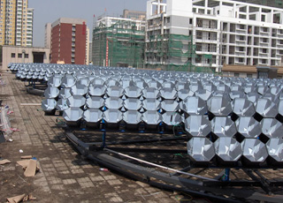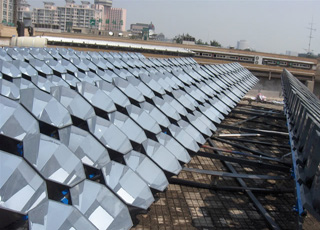 在我國,陳應(yīng)天教授發(fā)明了一種結(jié)構(gòu)簡單的二維聚光光漏斗,此光漏斗是一種八面體聚光器,以工程塑料一次注塑成型,經(jīng)過封裝,實(shí)現(xiàn)了均勻的一次反射式聚光。光漏斗的聚光比的設(shè)計(jì)依照用戶地區(qū)的全年平均光照質(zhì)量而定:在陽光一類地區(qū)使用4倍的聚光比,在陽光二類地區(qū)使用3倍的聚光比,在陽光三類地區(qū)使用2倍的聚光比,在其它云雨多、散射光非常充裕的地區(qū),使用固定的平板式電池已足夠,無需使用聚光和跟蹤裝置,因?yàn)樽饔貌淮蟆M瑫r(shí)陳應(yīng)天教授發(fā)明了一種方法,可以有效散熱,制成一個單片光電池的組件,光漏斗和一個光伏電池組件組成一個發(fā)電單元,可以在4個太陽聚光條件下可靠的工作。這種光漏斗法的聚光組件發(fā)明已經(jīng)申請了國家發(fā)明專利。根據(jù)不同的應(yīng)用需求,一臺發(fā)電機(jī)可以由18、36或更多的分離式的發(fā)電單元組成。由于是聚光型,發(fā)電機(jī)必須跟蹤太陽,為此,陳應(yīng)天教授發(fā)明了一種簡易、巧妙的計(jì)數(shù)方法,制造了低成本、可靠且準(zhǔn)確的太陽跟蹤控制裝置,將數(shù)倍聚光光伏電池發(fā)電機(jī)的發(fā)電量在此聚光的基礎(chǔ)上再提高20%-30%。