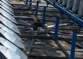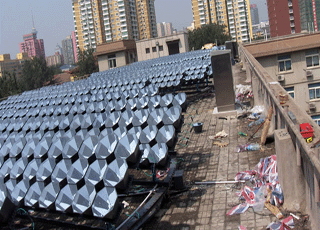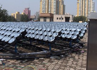 建設(shè)部推廣試用太陽能發(fā)電機(jī)組 鼓勵新能源利用技術(shù),倡導(dǎo)節(jié)能科技,城鄉(xiāng)與建設(shè)部在北附摟樓頂安裝了4個單盤功率5Kw的太陽能數(shù)倍聚光光伏電池發(fā)電機(jī)組,經(jīng)過幾天的安裝調(diào)試已經(jīng)開始試運(yùn)行,在太陽光不是很強(qiáng)的狀態(tài)下,單組發(fā)電機(jī)可以穩(wěn)定發(fā)出5Kwh的電能,并通過變頻設(shè)備將直流電裂變成三項(xiàng)交流電并入北京市電網(wǎng)。